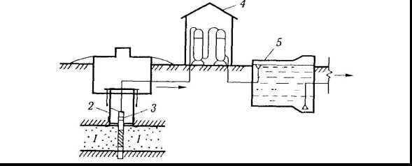 Схему споруд водогону з пiдземних джерел зображено на рис 2. За такою схемою подають воду з джерсл 1- та 2-го класiв. У разi подавання води з джерела 2-го класу її обов’язково знезаражують. Забiр пiдземних вод здiйснюють за допомогою вертикальних (шахтних колодязiв або свердловин) і горинзонтальних (траншейних або галерейних) споруд, променевих водозаборiв та каптажiв виходiв пiдземних вод. Вибiр типу споруд для забору пiдземних вод залежить вiд геологiчних i гiдрогеологiчних умов району, масштабу водоспоживання та економiчних розрахункiв.