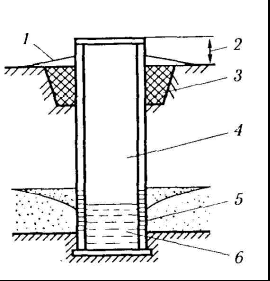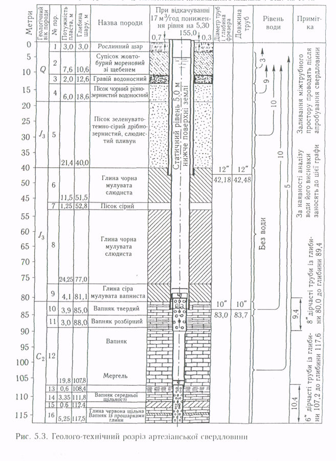 Основнi елементи свердловини зображено на рис. 3. Стiнки водозабірних свердловин у процесi бурiння закрiплюють технiчними або захисними обсадними трубами. Першу колону обсадних труб опускають на кілька метрiв глибше водоносного пласта, в якому є грунтовi води. Наступні колони обсадних труб, але меншого діаметра, проходять нижче розмiщених водоносних пластiв i занурюють на глибину 3-5 м у водонапiрний шар. У разi залягання експлуатованго пласта на великiй глибинi свердловину проходять кiлькома колонами обсадних труб. Верхня обсадна колона (кондуктор) забезпечує вертикальний напрям i захищає устя свердловини вiд потрапляння верхнiх забруднених вод, руйнування і розмивання. Дiаметр внутрiшньої експлуатацiйної колони визначається габаритними розмiрами фiльтра і занурювального насоса. Основною гiгiєнічною вимогою до свердловини є її герметичнiсть. З цiєю метою розмiщенi вище водоноснi пласти слiд проходити не менше, ніж двома колонами обсадних труб. Мiжтрубний простiр заливають цементним розчином пiд тиском.