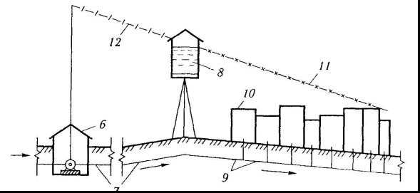 1- експлуатаційний водоносний горизонт; 2- водозабірна свердловина; 3- глибинна електропомпа; 4- водоочисна станція; 5- резервуар чистої води; 6- насосна станція другого підйому; 7- водогони; 8- водонапірна башта; 9- водопровідна мережа; 10- об’єкт водопостачання; 11- п’єзометрична лінія за максимального водоспоживання з мережі; 12- п’єзометрична лінія подавання води.