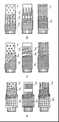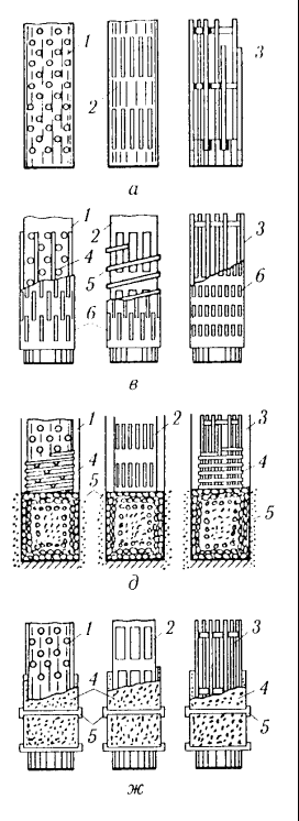 а- каркасного типу: 1- трубчастий фільтр-каркас з круглими отворами; 2- те саме, зі щільними отворами; 3- стрижневий фільтр-каркас на опорних кільцях або на закладних планках; б- каркасного типу з фільтрувальною поверхнею з дротяної обмотки: 1-3- те саме, що й на рис. 4,а; 4- підкладочні стрижні; 5- дротяна обмотка; в- каркасного типу з фільтрувальною поверхнею зі штампованого листа: 1-4- те саме,що й на рис. 4,а; 5- підкладочна спіральна обмотка; 6- штампований лист; г- каркасного типу з фільтрувальною поверхнею стінок: 1-3- те саме, що й на рис. 4,а; 4- підкладочна спіральна обмотка; 5- підкладочна гофрована сітка з вініпласту; 6- сітка; д- каркасного типу з гравійною, гравійно-піщаною обсипкою, що подається у забій свердловини: 1-3- те саме, що й на рис. 4,а; 4- дротяна обмотка; 5- гравійна чи гравійно-піщнана обсипка; е- каркасного типу