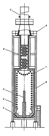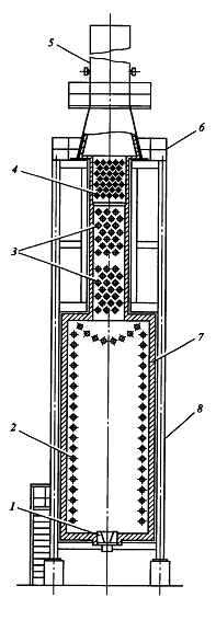 1 – змеевик конвекционных труб; 2 – змеевик радиантных труб; 3 – рассекатель-распределитель; 4 – футеровка; 5 – воздуходувка; 6 – каркас; 7 – дымовая труба; 8 – воздухоподогреватель.