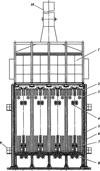 1 – камера конвекции; 2 – змеевик радиантных труб; 3 – взрывное окно; 4, 7 – гляделка; 5 – футеровка; 6 – каркас; 8 – горелка; 9 – лестничная площадка; 10 – дымовая труба