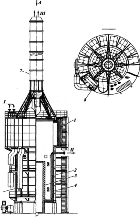 Печи типа КС – цилиндрические с кольцевой камерой конвекции, встроенным воздухоподогревателем, вертикальными трубными змеевиками в камерах радиации и конвекции и свободного вертикально-факельного сжигания топлива (рисунок 3.9).