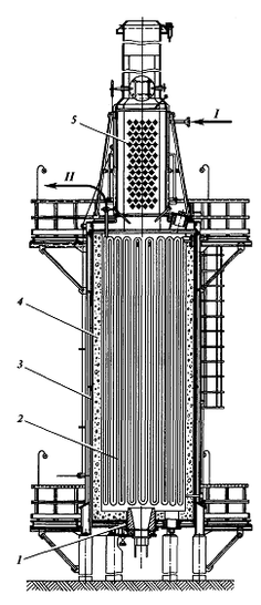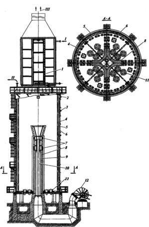 Цилиндрическая камера радиации установлена на столбчатом фундаменте для удобства обслуживания газовых горелок, размещенных в поду печи. Радиантный змеевик собран из вертикальных труб на приваренных калачах; в центре пода печи установлена газомазутная горелка. Змеевики упираются на под печи, вход и выход продукта осуществляется сверху.