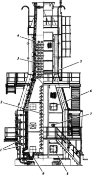 1 – горелка; 2 – змеевик радиантных труб; 3 – змеевик конвекционных труб; 4 – воздухоподогреватель; 5 – дымовая труба; 6 – лестничная площадка; 7 – футеровка; 8 – каркас