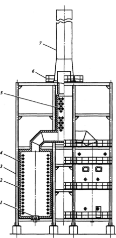 1 – горелка; 2 – змеевик радиантных труб; 3 – каркас; 4 – футеровка; 5 – змеевик конвекционных труб; 6 – лестничная площадка; 7 – дымовая труба