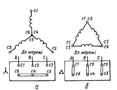 Сукупність секцій, які належать до однієї фази, називається фазною обмоткою. Виводи фаз обмотки прийнято позначати: С1, С2, С3 — початки і С4, С5, С6 — кінці відповідно першої, другої і третьої фаз. Окремі фази обмотки статора можуть з'єднуватися зіркою або трикутником. На рис. 2.3 наведено схеми з'єднання фаз обмотки статора і відповідні цим з'єднанням перемикання на щитку машини.