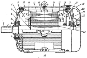 1, 9, 17 — болти, 2 я 23 — шпонки, 3 — вал ротора, 4 и 22 — роликовий і кульковий підшипники, 5,6 — зовнішня и внутрішня кришки підшипника, 7 — стопорне кільце, 8, 21 — підшипникові щити 10 — станина, 11 — статорна обмотка, 12 — осердя статора, 13 — гвинти кріплення осердя до станини, 14 — осердя ротора, 15 — замикаюче кільце, 16 — лопать вентилятора, 18 и 20 вентилятори, 19 — кожух вентилятора