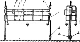 1 — каркас люльки; 2 — лебідка; 3 — уловлювач; 4 — канат вантажний; 5 — канат запобіжний; 6 — шафа керування; 7 — пульт керування.