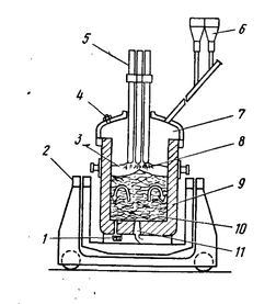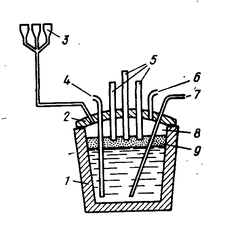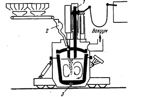 1 - электроды; 2 - бункер с вакуумным затвором для ввода добавок; 3 - пористая пробка для подачи инертного газа