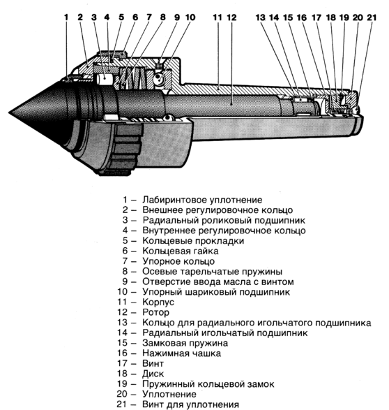 Центры фирмы Sandvik Coromant имеют и длинную вращающуюся часть, а также развитую систему подшипников. Тарельчатые пружины поддерживают постоянное усилие поджима заготовки центром (при жестком центре из-за постепенного износа и смятия поверхности контакта заготовки усилие уменьшается).