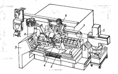 В шлифовальном ГПМ фирмы «Schaudt» предусмотрена автоматическая смена шлифовального круга (для наружного шлифования). Для этого узел шлифования 9 на крестовом суппорте подводится к правому внешнему ребру наклон! ной станины 7 и с помощью приспособления 2 производится автоматическая смена! Кроме того, возможна автоматическая смена из магазина (на 24 позиции) шлифовальных головок с помощью головок б (с левой стороны станины). Для автоматической смены изделий, закрепленных в передней 8 и задней 3 бабках, предназначен управляемый портальный загрузчик 7. В зависимости от модификации станок оборудован системой ЧПУ 5 («Siemens 810» – до 4-х осей либо «Siemens 850» – до 15 осей). Замеры диаметров и длин производятся устройством 4 в ходе процессов обработки деталей в любом месте (координата W). Для поддержания длинномерных деталей используются следящий люнет и задняя бабка 3.
