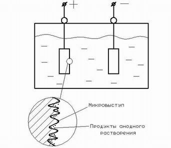 При подаче напряжения на электроды начинается процесс растворения материала заготовки-анода. Растворение происходит главным образом на выступах микронеровностей поверхности вследствие более высокой плотности тока на их вершинах. Кроме того, впадины между микронеровностями заполняются продуктами растворения: оксидами или солями, имеющими пониженную проводимость. В результате избирательного растворения, т.е. большей скорости растворения выступов, микронеровности сглаживаются и обрабатываемая поверхность приобретает металлический блеск. Электрополирование улучшает электрофизические характеристики деталей, так как уменьшается глубина микротрещин, поверхностный слой обрабатываемых поверхностей не деформируется, исключаются упрочнение и термические изменения структуры, повышается коррозионная стойкость.