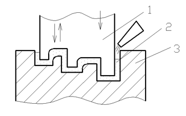 Рис.4. Ультразвуковая обработка: 1 – инструмент; 2 – деталь; 3 – абразивная суспензия.