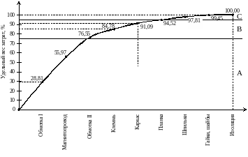 4. Построение диаграммы Парето. Диаграмма строится на основе СМ (рис.1) и расчёта затрат на МНФ трансформатора (табл.2), см. рис.2. Из рис.2 видно, что два наиболее дорогостоящих элемента (МНФ) попали в зону А, четыре элемента – в зону В и три элемента с наименьшими затратами попали в зону С.