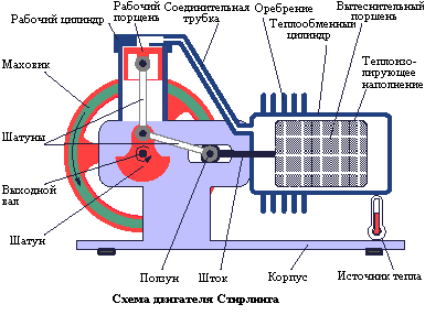 Двигатель состоит из рабочего и теплообменного цилиндров соединенных трубкой. В цилиндрах перемещаются соответсвенно рабочий и вытеснительный поршни, связанные шатунами, ползуном и штоком. Шатуны одеты на палец кривошипа, который находится на одном валу с маховиком. Источник тепла нагревает газ в правой части теплообменного цилиндра. Газ разширяется ичерез трубку оказывает давлением на рабочий поршень. Поршень опускается, толкает шатун и поворачиает маховик. При этом одновременно в право двигатеся вытеснительный поршень. Он вытесняет газ из нагревающейся части теплообменного цилиндра в его холодную часть, которая имеет охлаждающееся оребрение. Теплообменный поршень заполнен теплоизолирующим материалом. Газ остывает, создавая обратное усилие на рабочий поршень, поршень поднимается вверх и цикл повторяется с начала. Есть вариант двигателя в цилиндре которого устанавливались один над другим два поршня: вытеснитель и рабочий поршень. Вытеснитель делит полость над рабочим поршнем на две части "горячую" - расположенную между вытеснителем и торцом цилиндра и "холодную" - заключенную между поршнями. Обе части полости сообщаются между собой через перепускную магистраль, в которой последовательно установлены холодильник, примыкающий к "холодной" полости, регенератор и нагреватель, примыкающий к "горячей" полости. Задача вытеснителя состоит в перемещении рабочего тела из "горячей" полости в "холодную" и, наоборот, через перепускную магистраль. Поршни в цилиндре движутся попеременно, и их мертвые точки смещены. Двигатель Стирлинга впервые содержал теплообменник для регенерации тепла отработавшего горячего воздуха - регенератор . Существовавшие в то время материалы очень ограничивали уровень рабочих температур и давлений, что для двигателя Стирлинга было очень важно. Роберт Стирлинг выразил надежду, что препятствия, которые возникают из-за отсутствия соответствующих материалов со временем будут устранены. Он оказаля прав. В 20 веке о двигателе вспомнили снова. В настоящее время этот двигатель считается перспективным.
