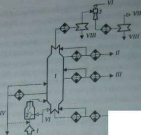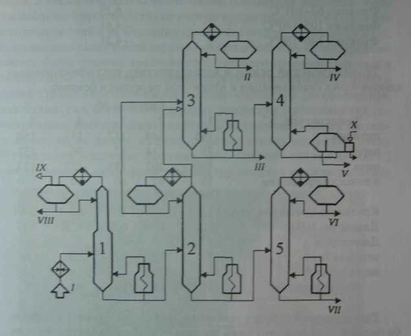 Тепло в низ колонны 4 подводится через кипятильник, а остальных колонн вторичной перегонки (2,3 и 5) - с горячей струей подогретого в печи
