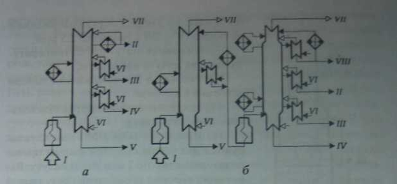Многие показатели качества (вязкость, индекс вязкости, нагарообразующая способность, температура вспышки и др.) товарных масел, а также технико-экономические показатели процессов очистки масляного производства во многом предопределяются качеством исходных нефтей и их масляных фракций. Поэтому в процессах ВТМ, по сравнению с вакуумной перегонкой топливного профиля, предъявляются более строгие требования к четкости погоноразделения и выбору сырья. Наиболее массовым сырьем для производства масел в нашей стране являются смеси западно-сибирских (самотлорская, усть-балыкская, сосниская) и волго-уральских (туймазинская, ромашкинская, волгоградская) нефтей. Для получения масел высокого качества из таких нефтей рекомендуется получать узкие 50-градусные масляные фракции (350-400; 400-450 и 450-500°С) с минимальным налеганием температур кипения смежных дистиллятов (не более 30-60°С). Для обеспечения требуемой четкости погоноразделения на ректификационных колоннах ВТМ устанавливают большее число тарелок (до 8 на каждый дистиллят), применяют отпарные секции; наряду с одноколонными широко применяют двухколонные схемы (двухкратного испарения по дистилляту) перегонки (рисунок 5 (а, б)).