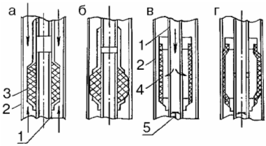 К гидравлическим (рис. 12, а) и б)) относят все пакеры, резиновые элементы которых деформируются и герметизируют колонну за счёт перепада давлений сверху и снизу пакера. Преимущество таких пакеров – способность воспринимать перепады давления 50 МПа (500 кгс/см3) и более; недостаток – сравнительная сложность конструкции.