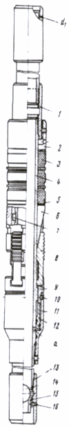 1 - головка пакера; 2 - упор манжет; 3 - манжеты; 4 - конус; 5 - плашка; 6 - плашкодержатель; 7 - цилиндр; 8 - захват; 9 - корпус фонаря; 10 - башмак фонаря; 11 - замок, ограничивающий взаимное передвижение ствола пакера и лишних деталей: 12 - гайка; 13 - палец замка: 14 - ствол пакера.