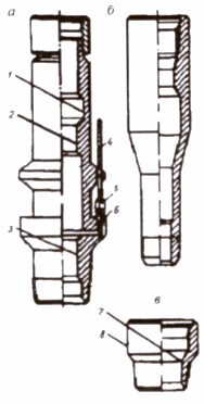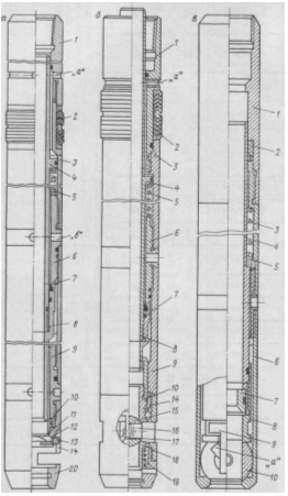 Рис.14. Клапаны-отсекатели типов КАУ-89-35 (а), КАУ-73-50 (б) и КА (в): а, б: 1 — муфта; 2 — уплотнение; 3 — цилиндр; 4 — поршень; 5, 12, 19 — пружины; 6 — переводник; 7—втулка; 8 — толкатель; 9 — корпус седла; 10 — седло; 11— хлопушка; 13 — ось; 14 — кожух; 15 —шар; 16 — плечо; 17 — штифт; 18- втулка; 20 — кольцо; в: 1 — головка,; 2 — уплотнение; 3 — пружина; 4 — шток; 5 — кольцо; 6 — корпус; 7 — дроссель; 8 — седло; 9 — плечо; 10 — шар.
