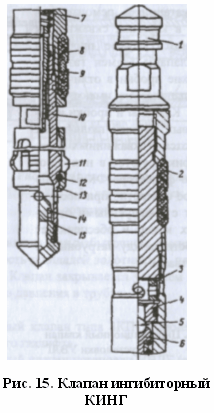 При помощи втулки 9 клапан настраивается на определенное давление открытия и, открываясь, перепускает ингибитор через втулку 9 и наконечник 14 внутрь полости подъемных труб. Обратный клапан 15 препятствует перетоку жидкости из полости подъемных труб в затрубное пространство.