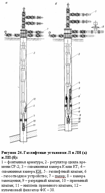 Для добычи нефти непрерывным газлифтным способом при подаче газа с поверхности выпускаются газлифтные установки типа Л, ЛН и ЛП (рис.24), обеспечивающие автоматический пуск и освоение скважины, а также ее стабильную работу в заданном режиме.