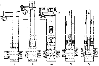 Рисунок 22. Оборудование скважин при периодическом газлифте: 1- периодический газлифт; 2 - периодический газлифт с камерой замещения; 3 - гидропакерный поршень; 4 - периодический газлифт с газлифтным и обратным клапанами; 5 - периодический газлифт с камерой замещением и газлифтным клапаном.