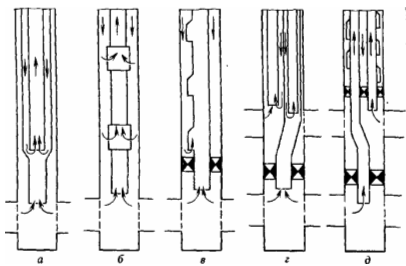 Рисунок 19. Газлифты: а — полуторарядный; б — однорядный с рабочими муфтами; в — однорядный с газлифтными клапанами; г — трехрядный; д - двухрядный.