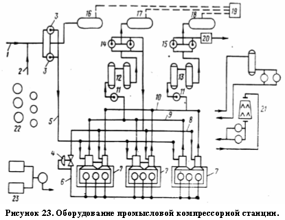 На рис. 23 показана схема оборудования компрессорной станции. По газопроводам 1 и 2 к станции поступает газ после предварительной обработки на установках подготовки нефти. Газ проходит сепараторы 3 для отделения жидкости и механических примесей и подается к компрессорам по линии 5 через регулятор давления «после себя» 4 к двигателям компрессоров 10ГК. Остальная, основная часть газа по трубопроводу 6 идет в цилиндры компрессоров 7. После сжатия в ступени 1 газ направляется по линии 9 в маслоотделители 11, холодильники первой ступени 12 и сепараторы среднего давления 14, где отделяется влага. Ко второй ступени газ подается по линии 8. Такая же обработка газа проводится и после второй ступени в аппаратах 11, 13 и 15. К этим аппаратам газ подается по линии 10. Влага от всех сепараторов поступает в емкости для конденсата 16, 17 и 18 и отбирается насосами насосной 19. Газ после сжатия и обработки направляется но линии 20 к потребителю (на газобензиновый завод, на скважины для газлифта и т. п.). Для охлаждения воды холодного и горячего цикла применяют градирни 21, где имеются емкость и насосная, расширительный бак с насосом горячего цикла. Для компрессорной, на которой установлено обычно 7—10 компрессоров, необходимо масляное хозяйство, так как расход масел различных марок велик (емкости и насосы маслохозяйства 22). Кроме того, запуск компрессора производится сжатым воздухом, запас которого в специальной емкости пополняется небольшими вспомогательными компрессорами 23.