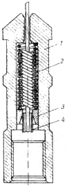 Замок для проволоки ЗП предназначен для соединения проволоки с инструментами, спускаемыми в скважину. Он состоит из корпуса 1, внутри которого размещен ролик 4, соединенный с пропущенной через отверстие в верхнем конце корпуса проволокой. Между роликом и торцом внутренней расточки корпуса помещена пружина 2 для смятения ударов и предохранения проволоки от обрыва при резком ее натяжении (например, при восходящем действии механического ясса). Опорой для нижнего конца пружины служит шайба 3.