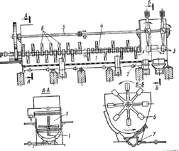 1- ваннa, 2 - лoжнoe дыpчaтoe днo, 3 - чepпaки для выrpyзки, 4 - вaл вpaщения, 5 - вал вращения черпаков, 6 – лопасти, 7 – набор для выгрузки тяжёлых примесей.