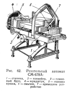 Перед пуском в работу резательного автомата его очищают от пыли и глины, подготовляют сушильные рамки и вагонетки, заготовляют в запас резательную проволоку, проверяют натяжение ее в лучке, работу оросительной системы и линии водопровода, осматривают подшипники основных узлов. После этого проверяют работу автомата вхолостую, поворачивая вручную приемный конвейер бруса.