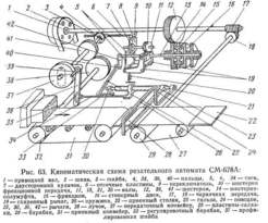 Автомат СМ-678А (рис. 63) работает следующим образом: приемный конвейер 31 автомата перемещается под давлением глиняного бруса. Один из барабанов 32 конвейера получает вращение через вал 35 и шестерни 38 и 41 от вала, на котором насажена профилированная шайба 37, управляющая работой всех механизмов автомата. Таким образом, все изменения скорости глиняного бруса передаются через ленту конвейера 31 и барабан 32 профилированной шайбе 37. Шайба через палец 39, рычаг 36, тягу 34, поводок и гильзу 23 сообщает возвратно-поступательное движение валу 21 с лучком 26 и поводку 24 с пластинами-салазками 28.