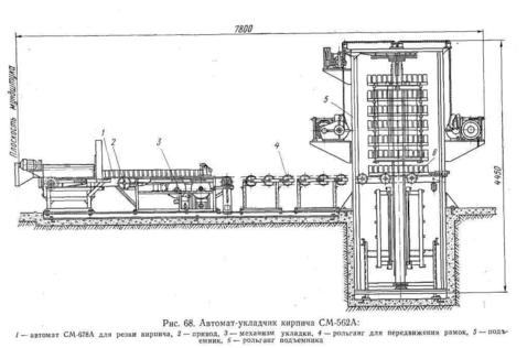 Автомат-укладчик кирпича СМ-562А (рис. 68) на вагонетки туннельных сушилок СМ-41 состоит из механизма укладки 3 кирпича, магазина для рамок, рольганга 4 для передвижения рамок с кирпичом, подъемника 5 с рольгангом 6, тележки, электрооборудования, толкателя и привода.