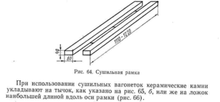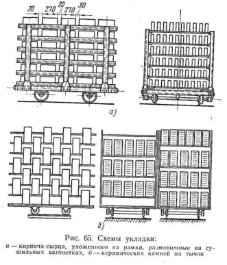 В зависимости от размеров вагонетки на каждую рамку укладывают 10—12 шт. кирпича-сырца с равномерными зазорами между смежными кирпичами (рис. 65).
