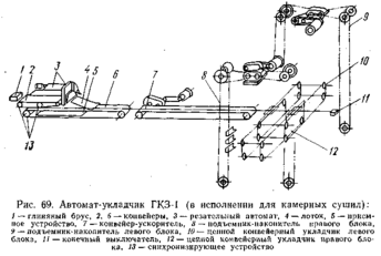 Автомат-укладчик состоит из следующих основных узлов (рис. 69): конвейера 2, резательного автомата 3 типа СМ-678А, синхронизирующего устройства 13, приемного устройства 5 сушильных рамок, лотка (склиза) 4, конвейера сушильных рамок, конвейера-ускорителя 7, подъемника-накопителя 8 правого блока, подъемника-накопителя 9 левого блока, цепного конвейерного укладчика 10 левого блока, конечного выключателя И, цепного конвейерного укладчика 12 правого блока.
