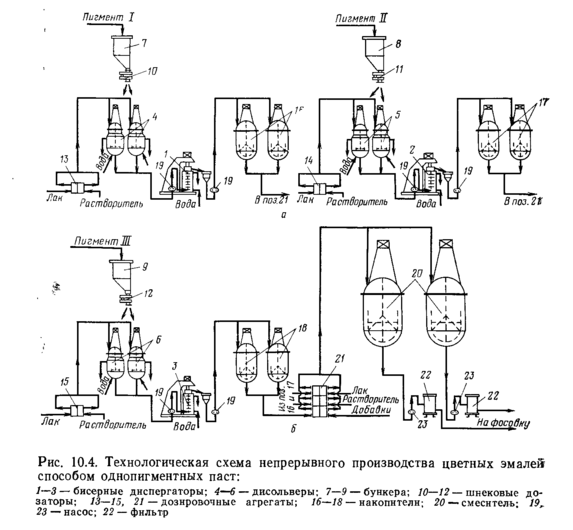 По одному из них диспергированию в растворе полимера (лака) подвергается вся смесь пигментов, предусмотренная по рецептуре; при этом получается пигментная паста, соответствующая по цвету приготавливаемой эмали (способ цветных паст). По другому способу каждый пигмент (или смесь пигментов одного цвета) отдельно диспергируют в лаке, в результате чего получают разноцветные одиопигментные (или одноколерные) пасты, которые смешивают при составлении эмали (способ одиопигментных паст). По третьему способу вначале также получают однопигментные (или одноколерные) пасты, после чего их разбавляют (лаком, растворителем) до вязкости, близкой к вязкости готовой эмали, и только после этого смешивают в соотношениях, зависящих от цвета приготавливаемой эмали. Разбавленные одиопигментные (одноколерные) пасты обычно называют однопигментными полуфабрикатными эмалями. Этот способ используют редко, так как для его проведения требуется много вспомогательного оборудования.