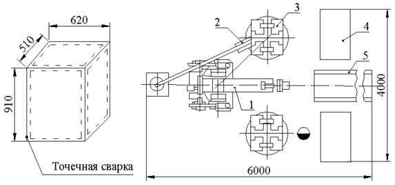 1 - ПР мод. РБ - 110; 2 - автомат точечной сварки; 3 - устройство гибки; 4 - накопитель изделий после сварки (стеллаж).