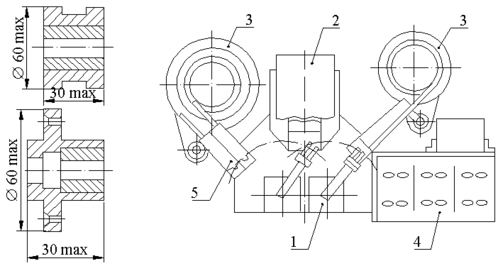 1 - автоматический манипулятор мод. РСК 02.12 (2 шт.); 2 - пневмопресс мод. РСК 02.11; 3 - вибробункер мод. ВПУ - 250А (2 шт.); 4 - устройство управления манипулятором; 5 - конвейер отводящий (вибролоток).