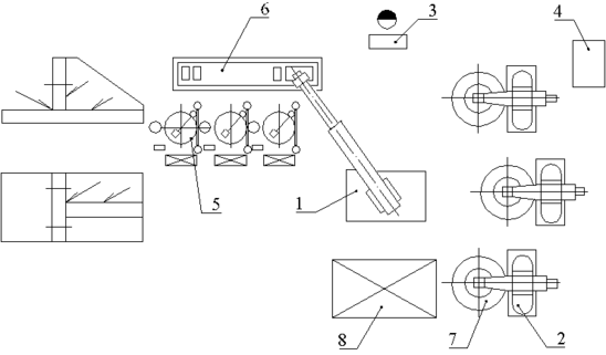 ПР мод. "Универсал 15М"; 2 - сварочный ПР мод. 109А (3 шт.); № - пульт управления; 4 - устройство управления; 5 - позиция предварительной сборки (3 шт.); 6 - конвейер (6 шт.); 7 - стол - кантователь (3 шт.); 8 - склад - стеллаж изделий.
