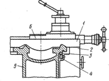 расточке верхних салазок 5 установлена коническая оправка 3 с резьбовым концом. На конусе оправки установлена четырех­сторонняя резцовая головка 6. При вра­щении рукоятки 4 головка 2 перемещается вниз по резьбе конической оправки 3 и че­рез шайбу 1 и упорный подшипник обеспе­чивает жесткую посадку резцовой голов­ки 6 на конической поверхности оправки 3. От проворота при закреплении резцовая головка удерживается шариком, который заклинивается между поверхностями, об­разованными пазом на основании кониче­ской оправки 3 и отверстием в резцовой головке 6.