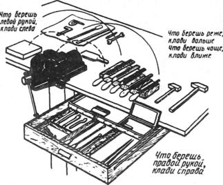 инструменты и материалы, которые во время работы требуются чаще, размещают ближе к себе, а применяемые реже – дальше; все используемые предметы располагают примерно на высоте пояса;