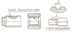 Многозаходные резьбы, например трех-заходная, обозначается М24(З(P1)LH, где М – тип резьбы, 24 – номинальный диаметр, 3 – ход резьбы, P1 – шаг резьбы. Приведенные обозначения левой и многозаходной резьб могут быть отнесены ко всем метрическим резьбам.