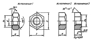 Гайка — крепежная деталь с резьбовым отверстием в центре. Применяется для навинчивания на болт или шпильку до упора в одну из соединяемых деталей. В зависимости от названия и условий работы гайки выполняют шестигранными, круглыми, барашковыми, фасонными и т. д. Наибольшее применение имеют гайки шестигранные. Их изготовляют трех исполнений: исполнение l — с двумя коническими фасками (рис. 3); исполнение 2 — с одной конической фаской; исполнение 3 — без фасок, но с коническим выступом с одного торца. Форму гайки на чертеже вполне передают два ее вида: на плоскости проекций, параллельной оси гайки, совмещают половину вида с половиной фронтального разреза, и на плоскости, перпендикулярной оси гайки, со стороны фаски. На чертеже указывают размер резьбы, размер S под ключ и дают обозначение гайки по стандарту.