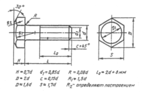 Болт представляет собой цилиндрический стержень с головкой на одном конце и резьбой на другом конце. Болты используются (вместе с гайками, шайбами) для скрепления двух или нескольких деталей. Существуют различные типы болтов, отличающиеся друг от друга по форме и размерам головки и стержня, по шагу резьбы, по точности изготовления и по исполнению. При изображении болта на чертеже выполняют два вида (рис. 2) по общим правилам и наносят размеры длины l болта, длины резьбы /о, размер под ключ S и обозначение резьбы Md. Высота H головки в длину болта не включается. Гиперболы, образованные пересечением конической фаски головки болта с ее гранями, заменяются другими окружностями.