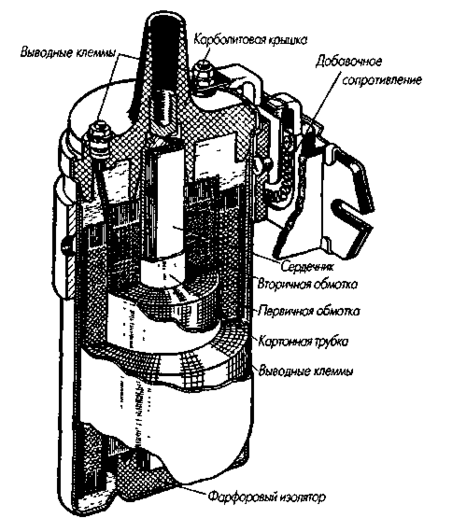 Катушка зажигания служит для преобразования тока низкого напряжения в ток высокого напряжения (с 12 В до 20—24 тыс. В). Она состоит из следующих основных частей (рис. 1): сердечника, первичной обмотки из толстого изолированного провода диаметром 0,8 мм, картонной трубки, вторичной обмотки, состоящей из 18—20 тыс. витков тонкого провода, железного корпуса с магнитопроводами, карболитовой крышки, клемм и дополнительного сопротивления. Вторичная обмотка изолирована от первичной слоем изоляции. Концы первичной обмотки выведены на клеммы карболитовой крышки. Один конец вторичной обмотки соединен с первичной обмоткой, а второй выведен на центральную клемму карболитовой крышки.