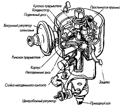 Прерыватель-распределитель служит для прерывания тока в первичной цепи катушки зажигания, распределения высокого напряжения по цилиндрам двигателя и изменения угла опережения зажигания в зависимости от частоты вращения коленчатого вала и нагрузки двигателя. Прерыватель-распределитель представляет собой устройство, состоящее из следующих конструктивных элементов: прерывателя, распределителя, центробежного регулятора, вакуумного регулятора, октан-корректора, конденсатора.