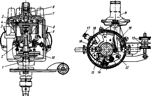 1 — ведущий валик; 2 — опорная пластина; 3 — фильц; 4 — ротор; 5 — крышка; 6 — клемма высокого напряжения; 7 — пружина контактного уголька; 8 — контактный уголек; 9 — защелка крышки; 10 — центробежный регулятор; 11 — вакуумный регулятор; 12 — регулировочные гайки октан-корректора; 13 — регулировочный винт (эксцентрик); 14 — рычажок-прерыватель; 15— винт крепления пластины неподвижного контакта; 16 — фильц смазки кулачка; 17— клемма прерывателя; 18 — провод изолированный; 19 — провод "массы".