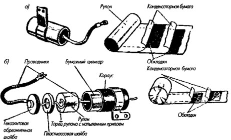 Конденсатор (рис. 9) состоит из корпуса, внутри которого размещены свернутые рулоном две полосы алюминиевой фольги, изолированные друг от друга специальной бумагой. Одна из лент присоединена к "массе", а другая проводом к изолированному рычажку прерывателя. В последнее время применяют малогабаритные, герметизированные конденсаторы, у которых на бумагу, пропитанную маслом, напилен тонкий слой олова, а поверх его тонкий слой цинка. Крепится конденсатор на корпусе прерывателя снаружи или на подвижном диске.
